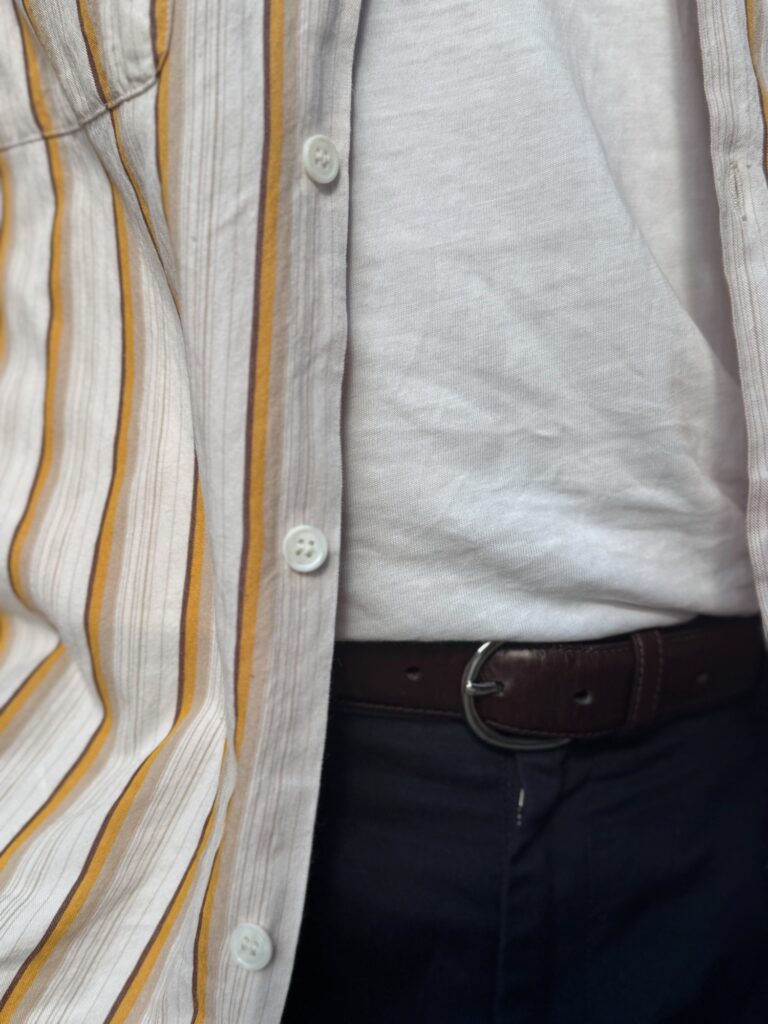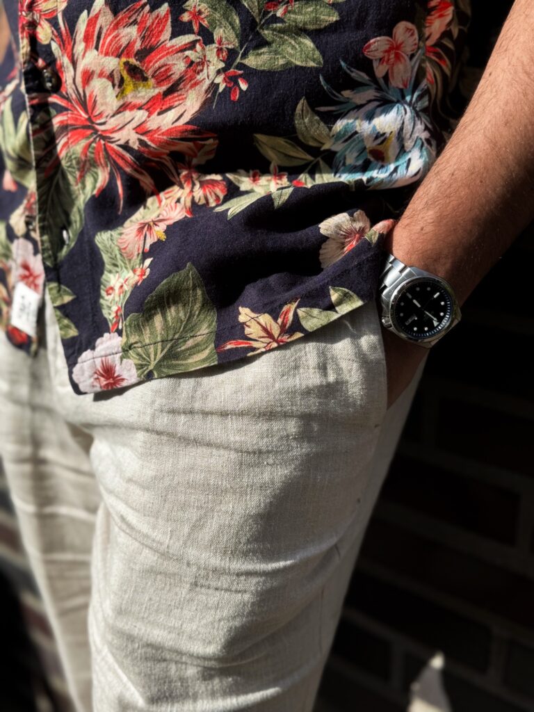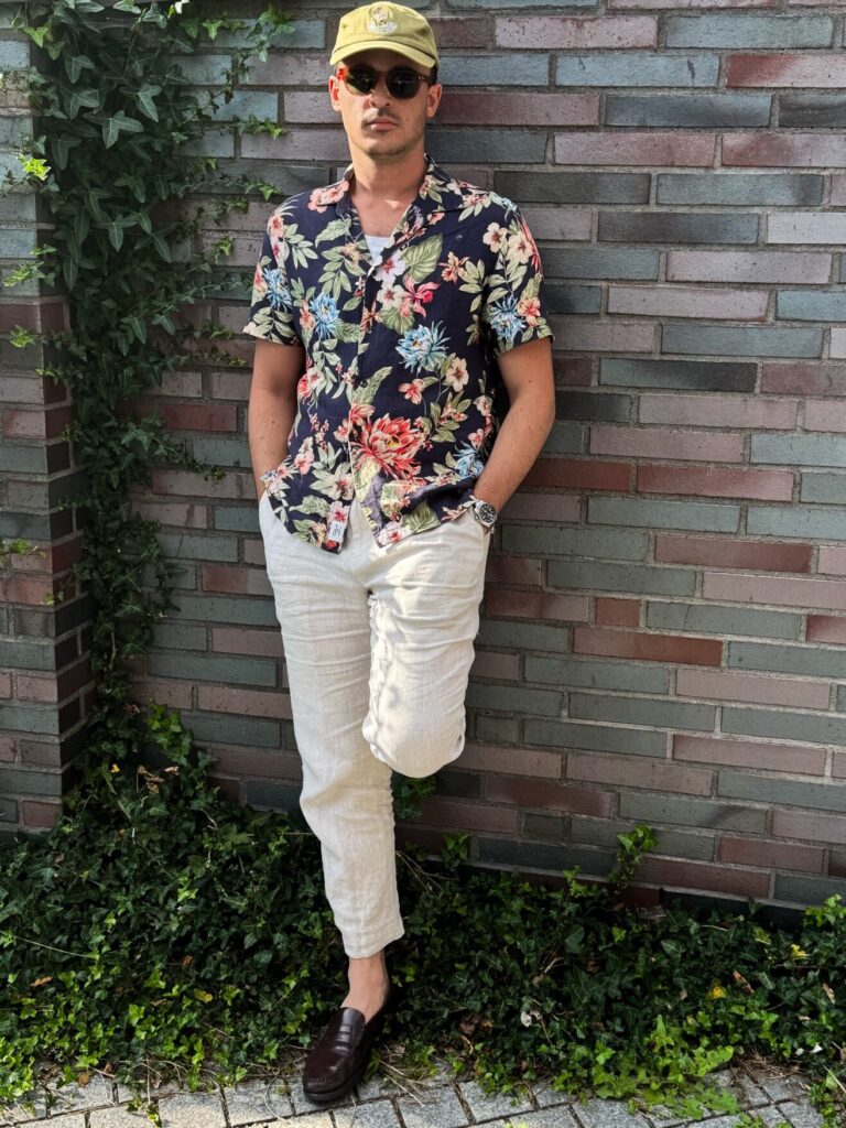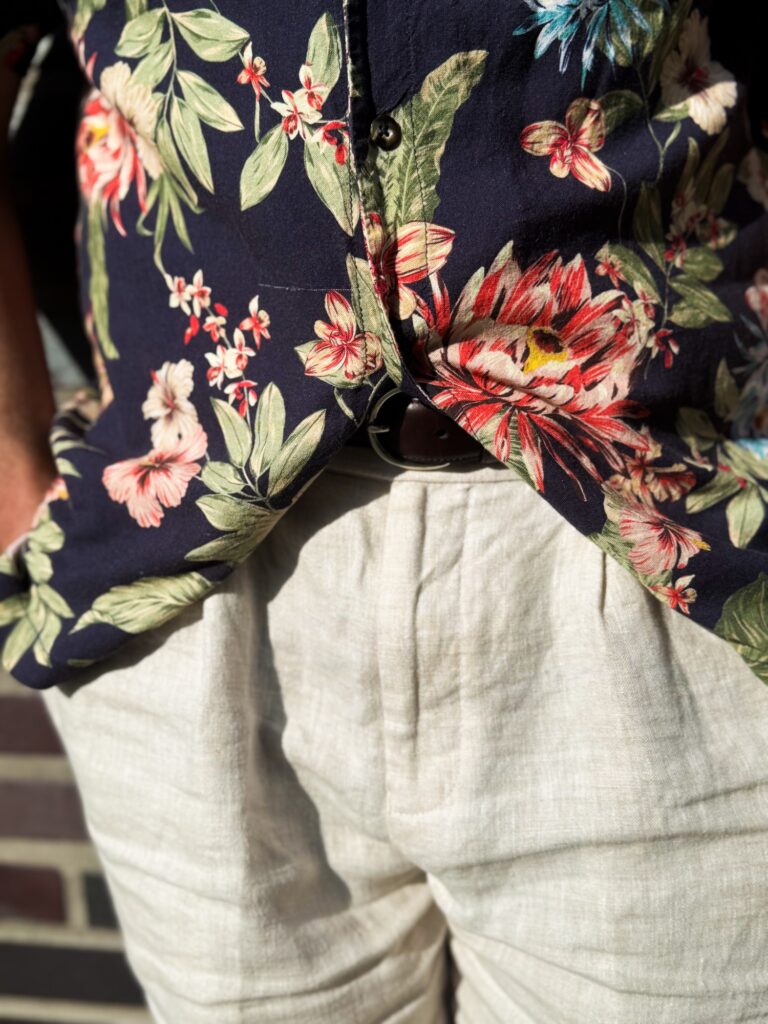 I tried to elevate the Hawaiian shirt by pairing it with pleated linen trousers. The pleats add a touch of formality while maintaining the summer vibe. The linen fabric echoes that of the shirt perfectly. And the color combo? Chef’s kiss.