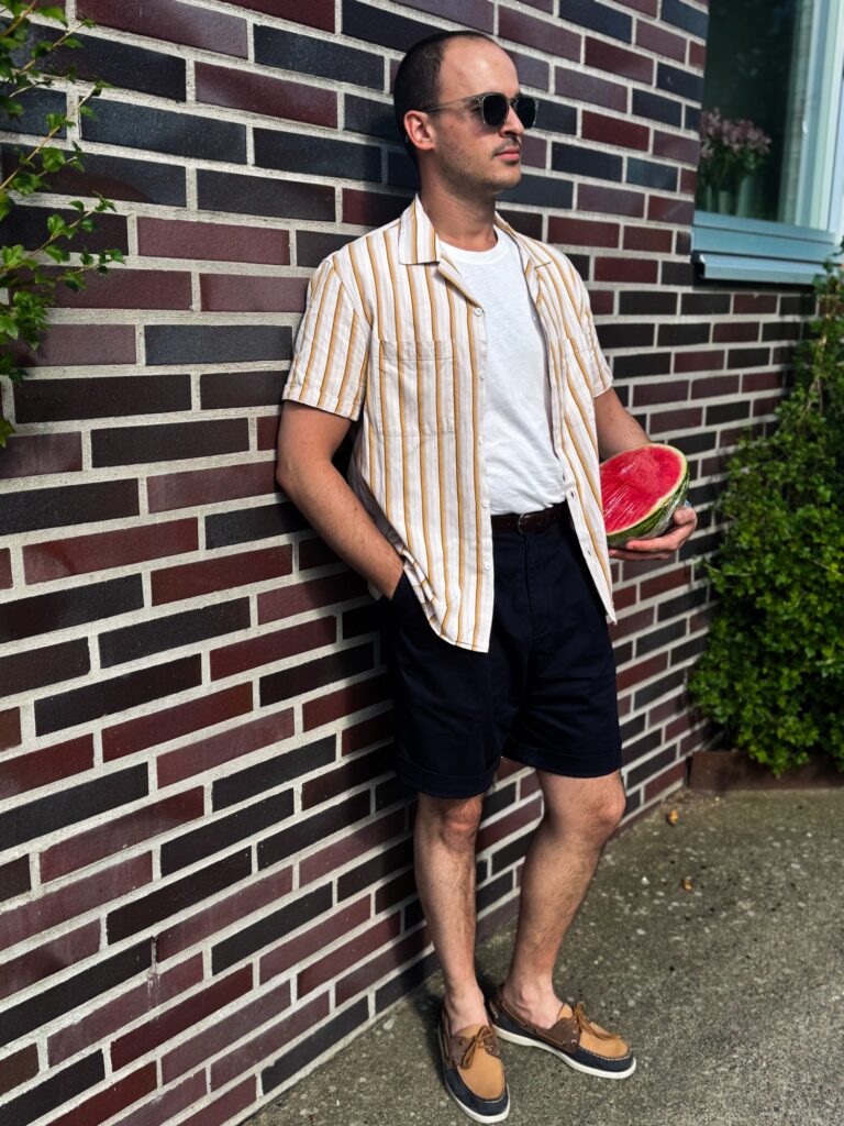 This time, I wore pleated shorts from Samsøe Samsøe, which add nice structure and detail. Instead of a tank top, I layered the shirt over a white Uniqlo T-shirt and left it unbuttoned. A perfectly valid option—as long as you’re wearing something underneath 😉